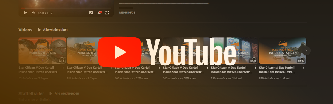 Auf unserem YouTube-Kanal kannst du dich durch unsere KRT NEWS über die aktuellen und vergangenen Aktionen im Kartell informieren. Wir bieten außerdem regelmäßig Übersetzungen der CIG-Serie Inside Star Citizen in deutsch an und weitere interressante Releases unserer Mitglieder rund um Star Citizen.