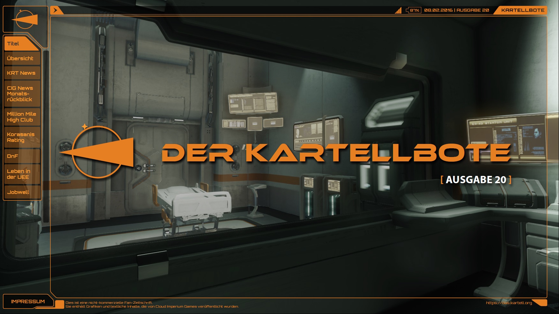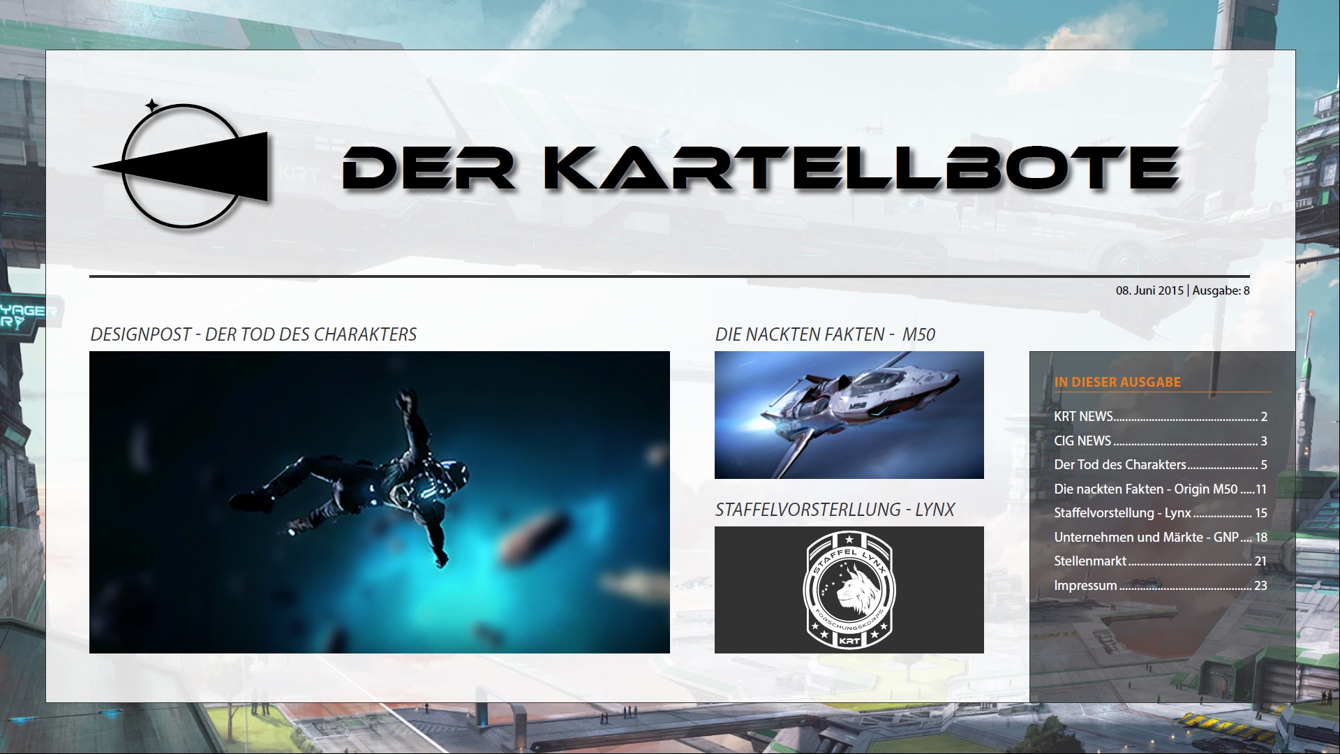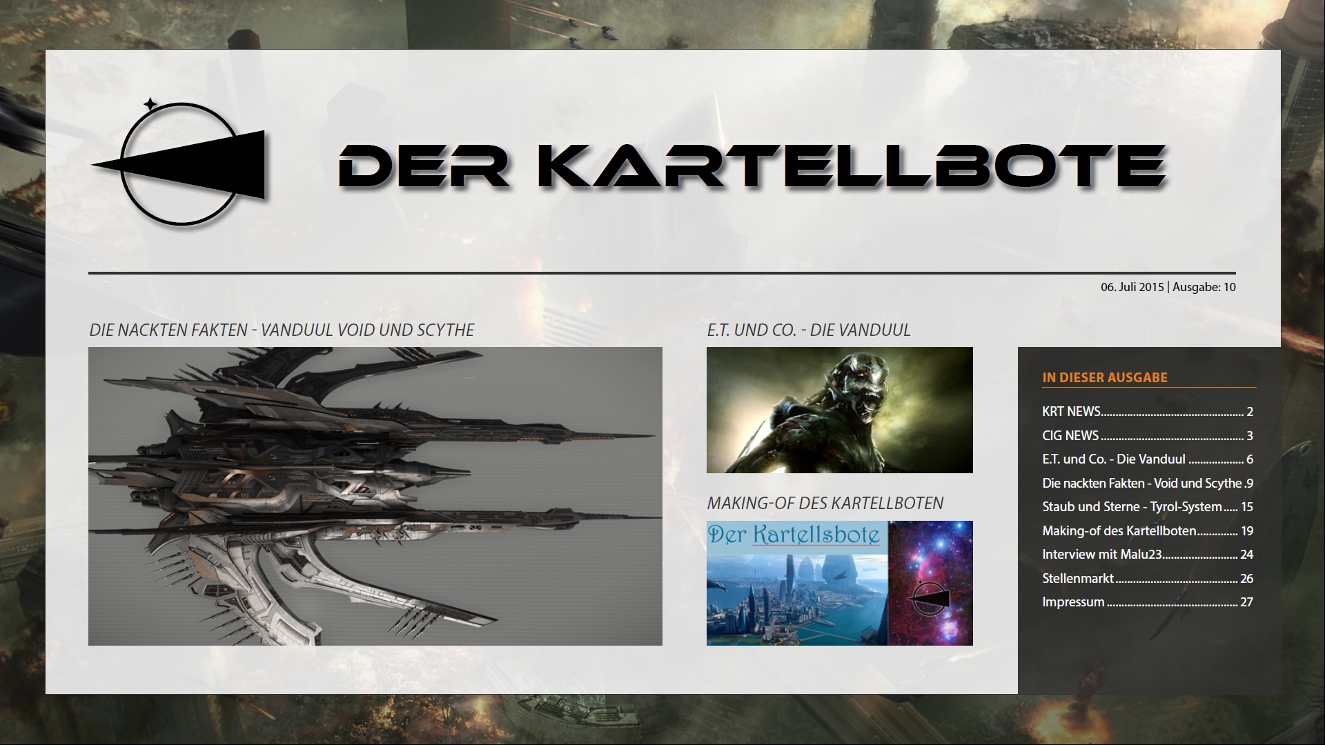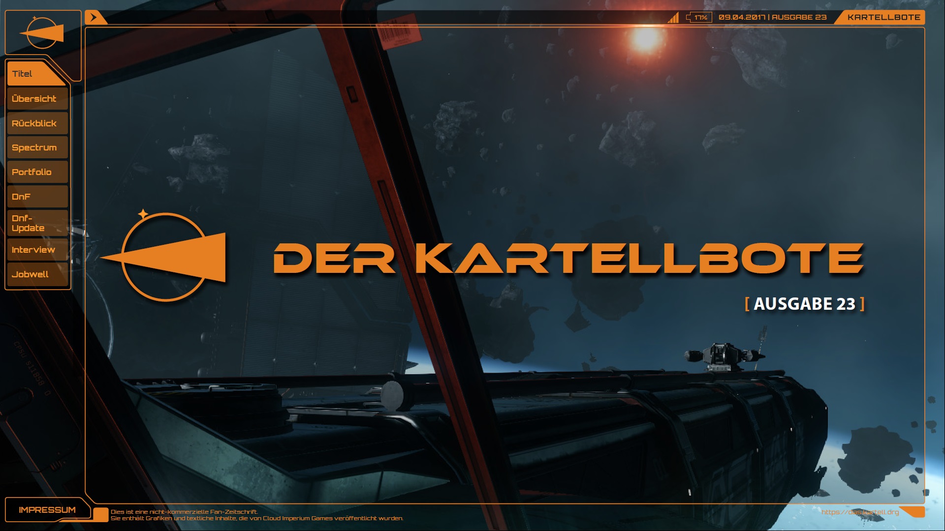 Hier findet ihr eine Übersicht sämtlicher Ausgaben der Kartell-Magazine "Der Kartellbote" und "The Chronos Times". Damit die interaktive Menüführung des Kartellboten funktioniert, empfehlen wir, die PDF herunterzuladen und in einem PDF-Viewer zu betrachten, anstatt sie sich im Browser anzuschauen. Um uns Feedback zukommen zu lassen, könnt ihr dieses Thema in unserem Forum verwenden. Wir wünschen viel Spaß beim Lesen!