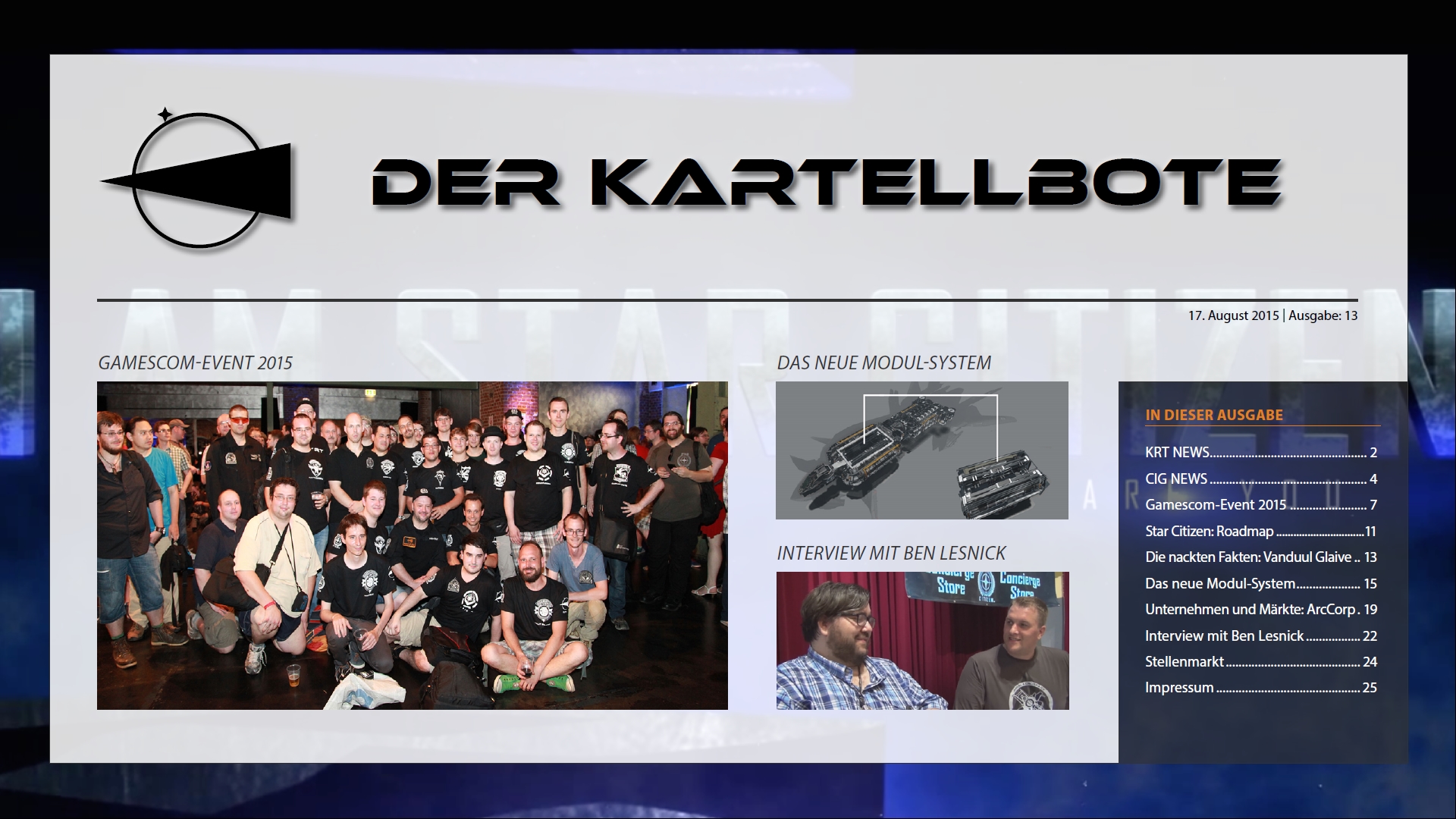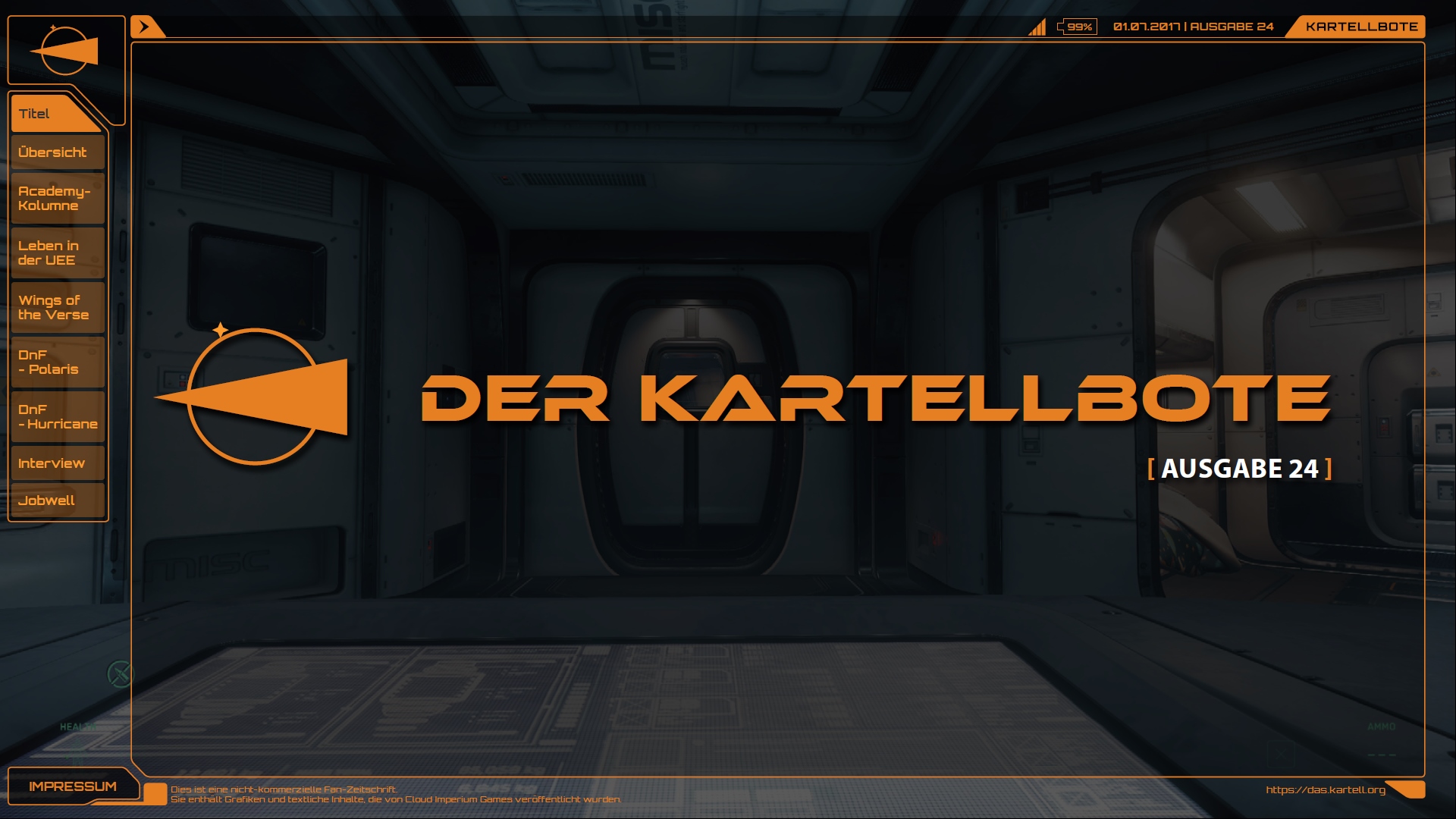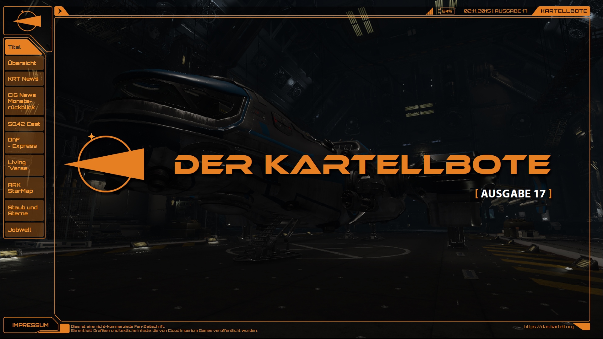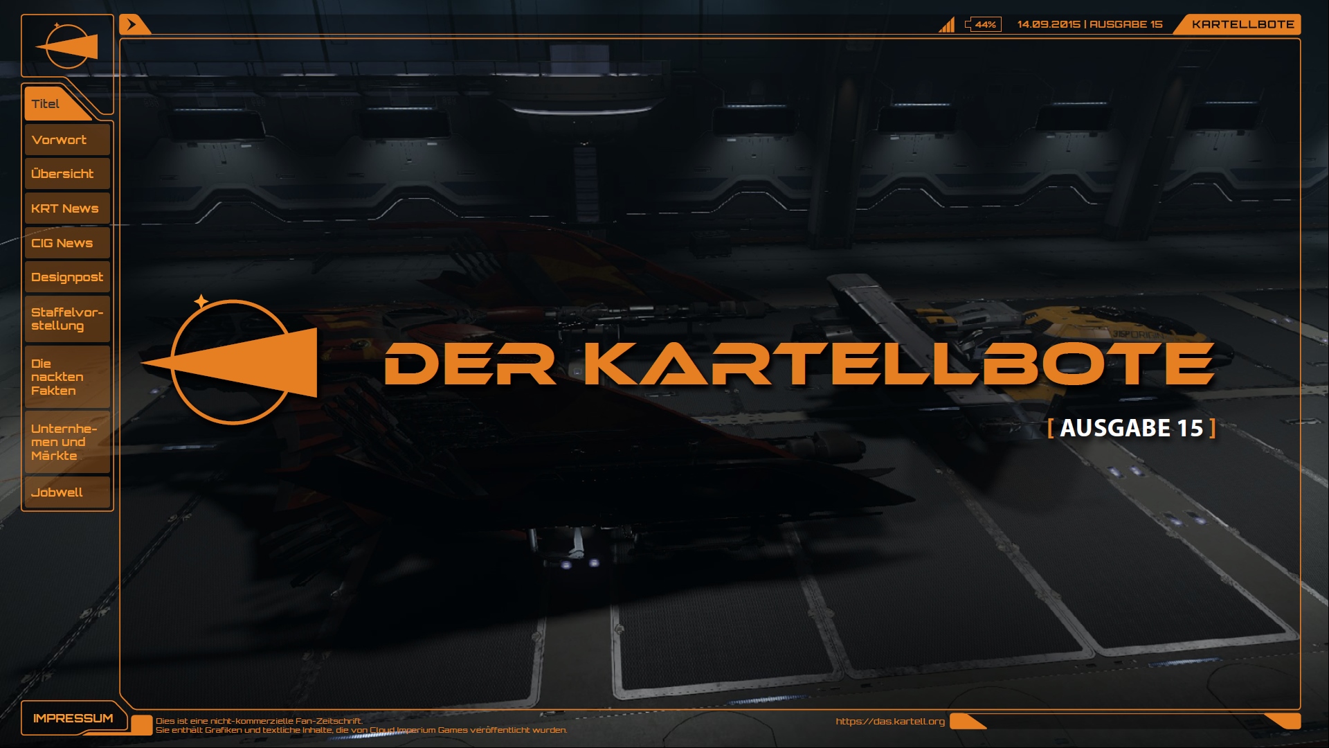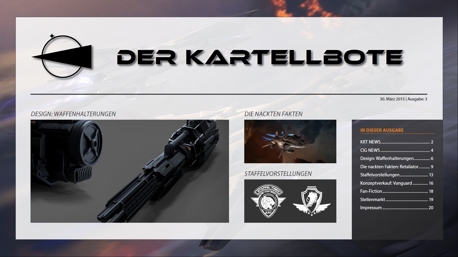 Hier findet ihr eine Übersicht sämtlicher Ausgaben der Kartell-Magazine "Der Kartellbote" und "The Chronos Times". Damit die interaktive Menüführung des Kartellboten funktioniert, empfehlen wir, die PDF herunterzuladen und in einem PDF-Viewer zu betrachten, anstatt sie sich im Browser anzuschauen. Um uns Feedback zukommen zu lassen, könnt ihr dieses Thema in unserem Forum verwenden. Wir wünschen viel Spaß beim Lesen!