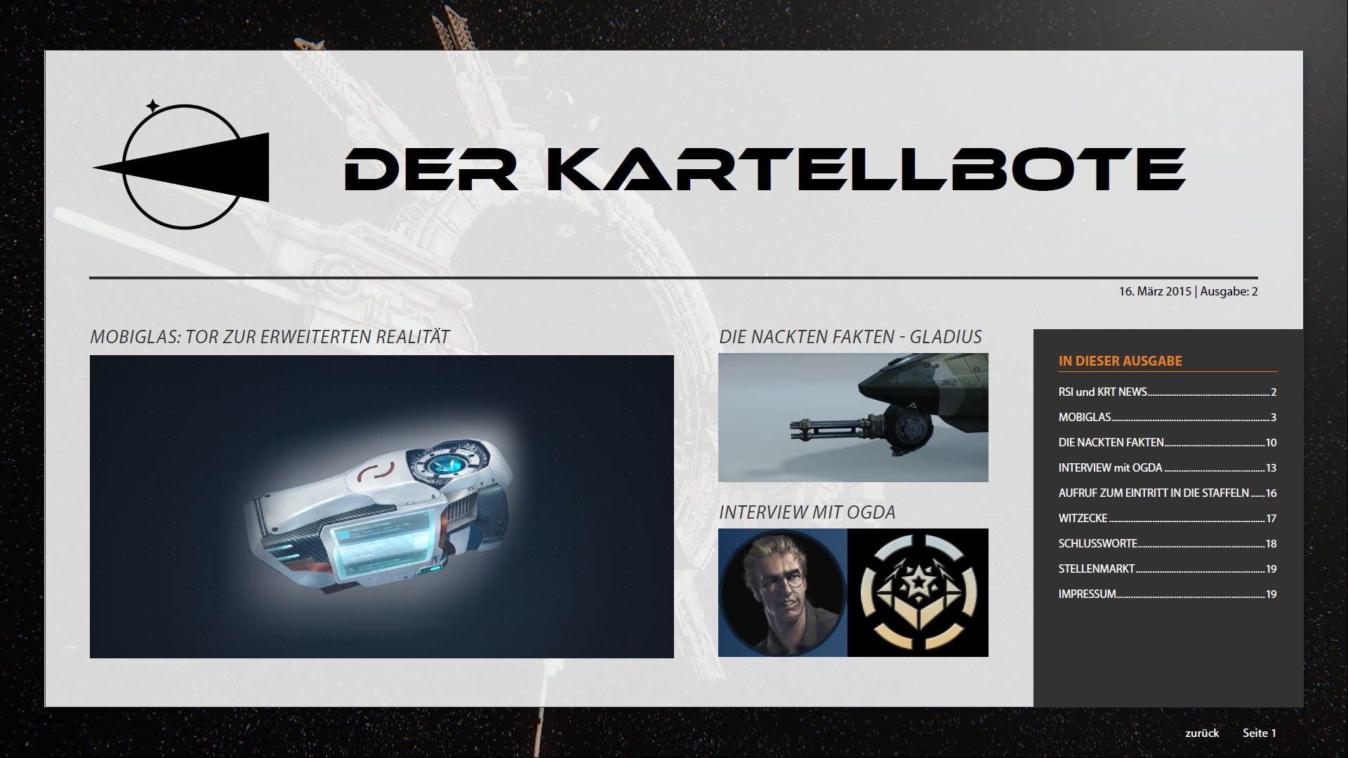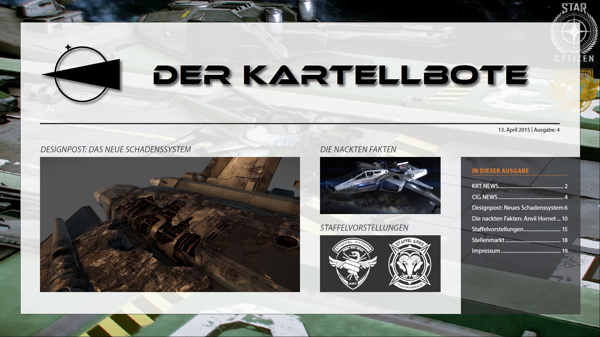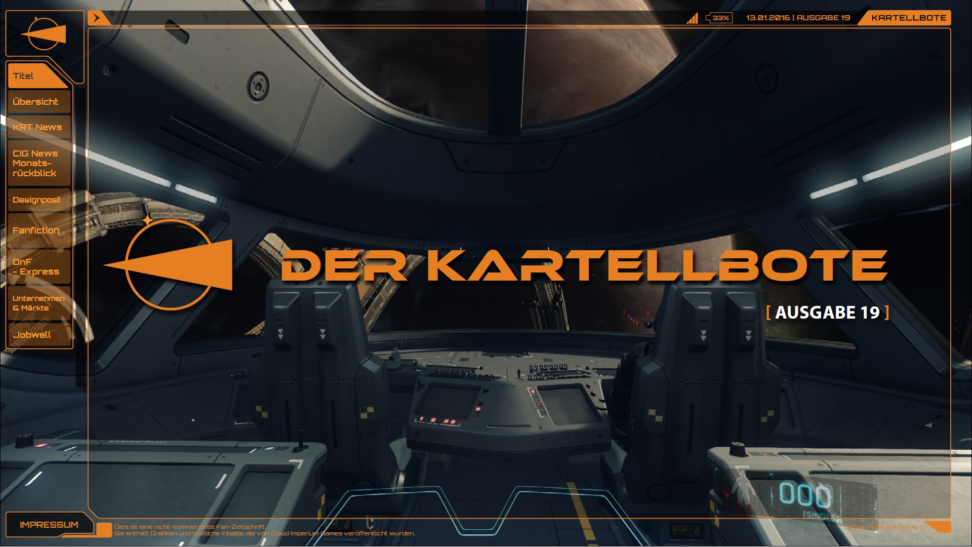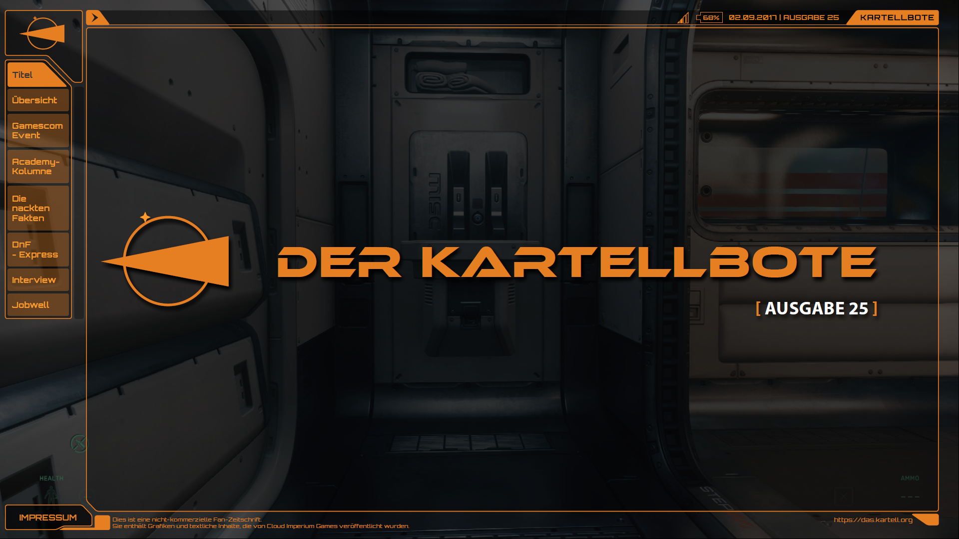 Hier findet ihr eine Übersicht sämtlicher Ausgaben der Kartell-Magazine "Der Kartellbote" und "The Chronos Times". Damit die interaktive Menüführung des Kartellboten funktioniert, empfehlen wir, die PDF herunterzuladen und in einem PDF-Viewer zu betrachten, anstatt sie sich im Browser anzuschauen. Um uns Feedback zukommen zu lassen, könnt ihr dieses Thema in unserem Forum verwenden. Wir wünschen viel Spaß beim Lesen!