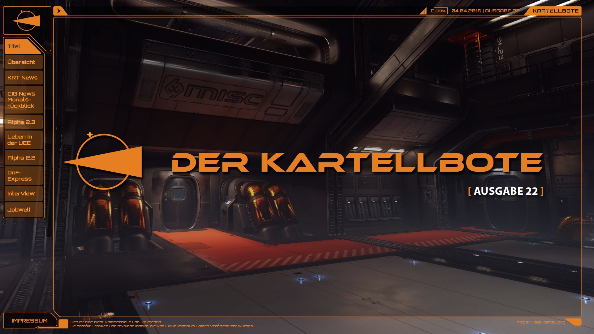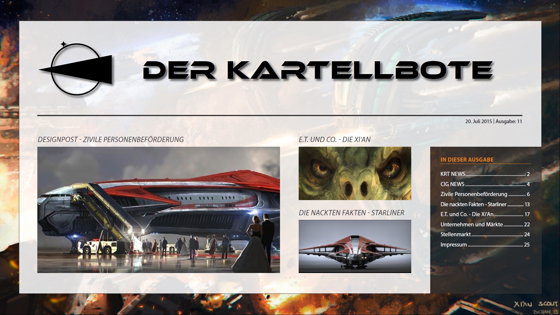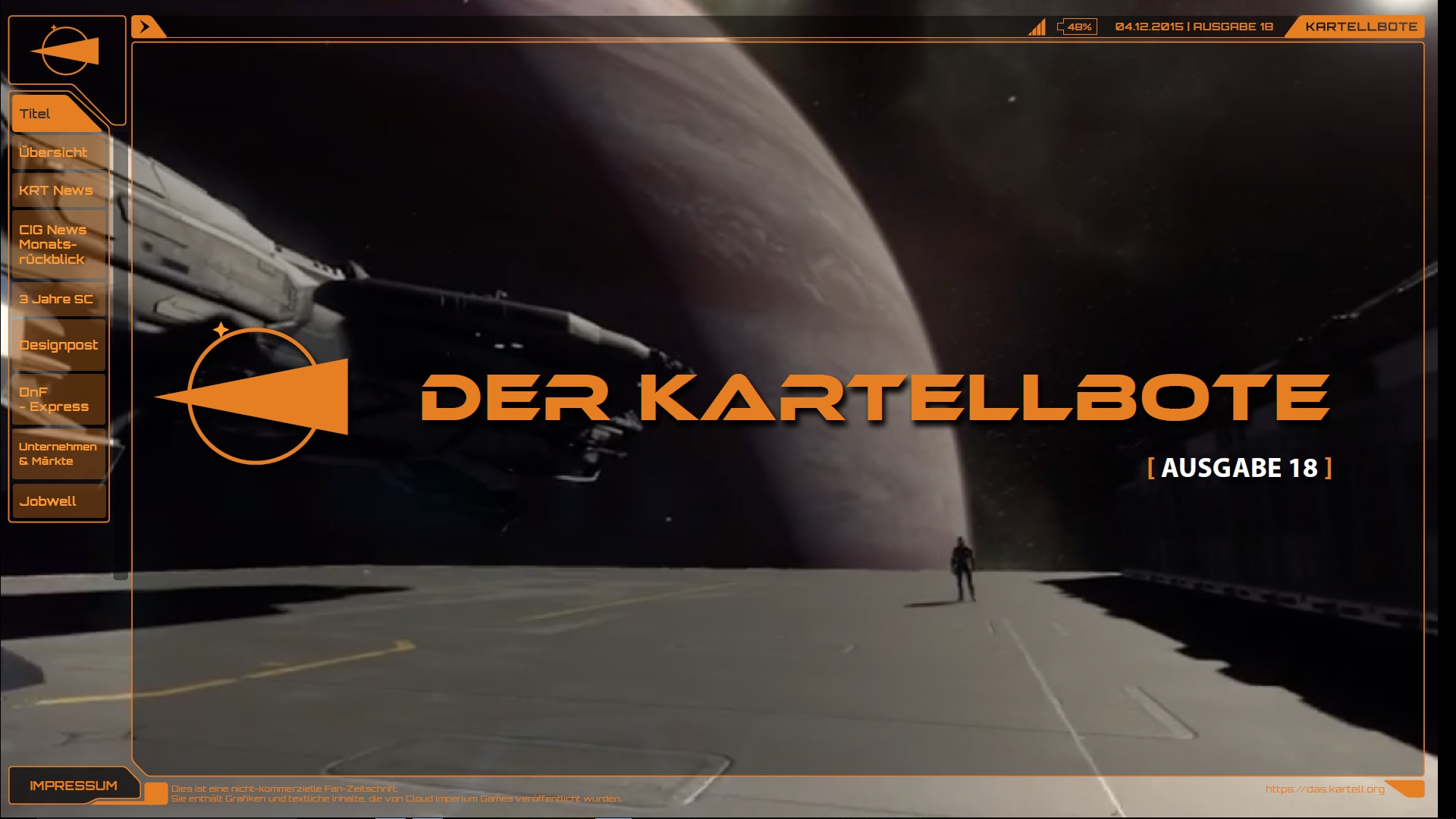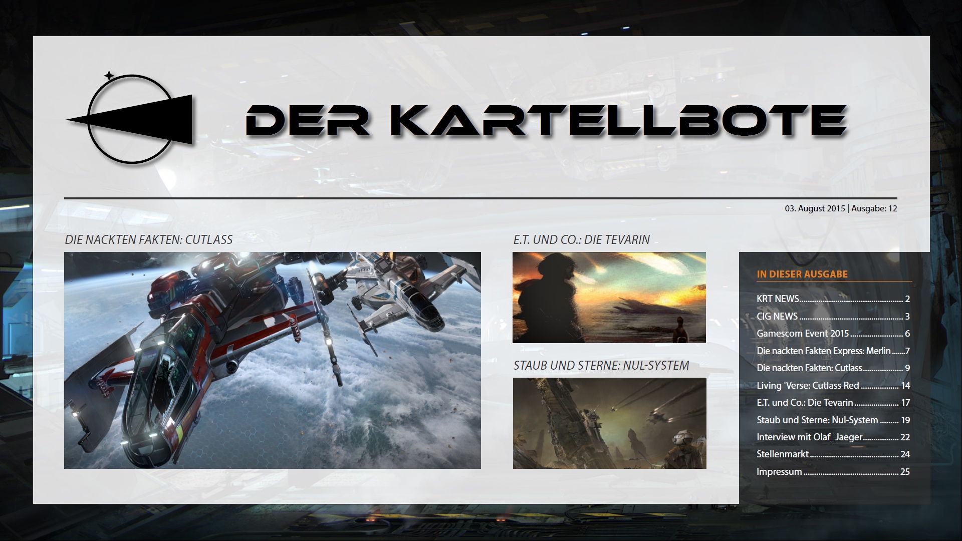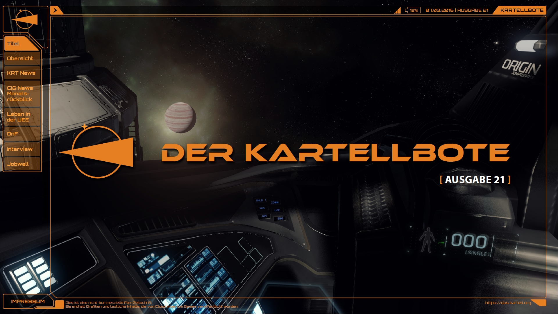 Hier findet ihr eine Übersicht sämtlicher Ausgaben der Kartell-Magazine "Der Kartellbote" und "The Chronos Times". Damit die interaktive Menüführung des Kartellboten funktioniert, empfehlen wir, die PDF herunterzuladen und in einem PDF-Viewer zu betrachten, anstatt sie sich im Browser anzuschauen. Um uns Feedback zukommen zu lassen, könnt ihr dieses Thema in unserem Forum verwenden. Wir wünschen viel Spaß beim Lesen!