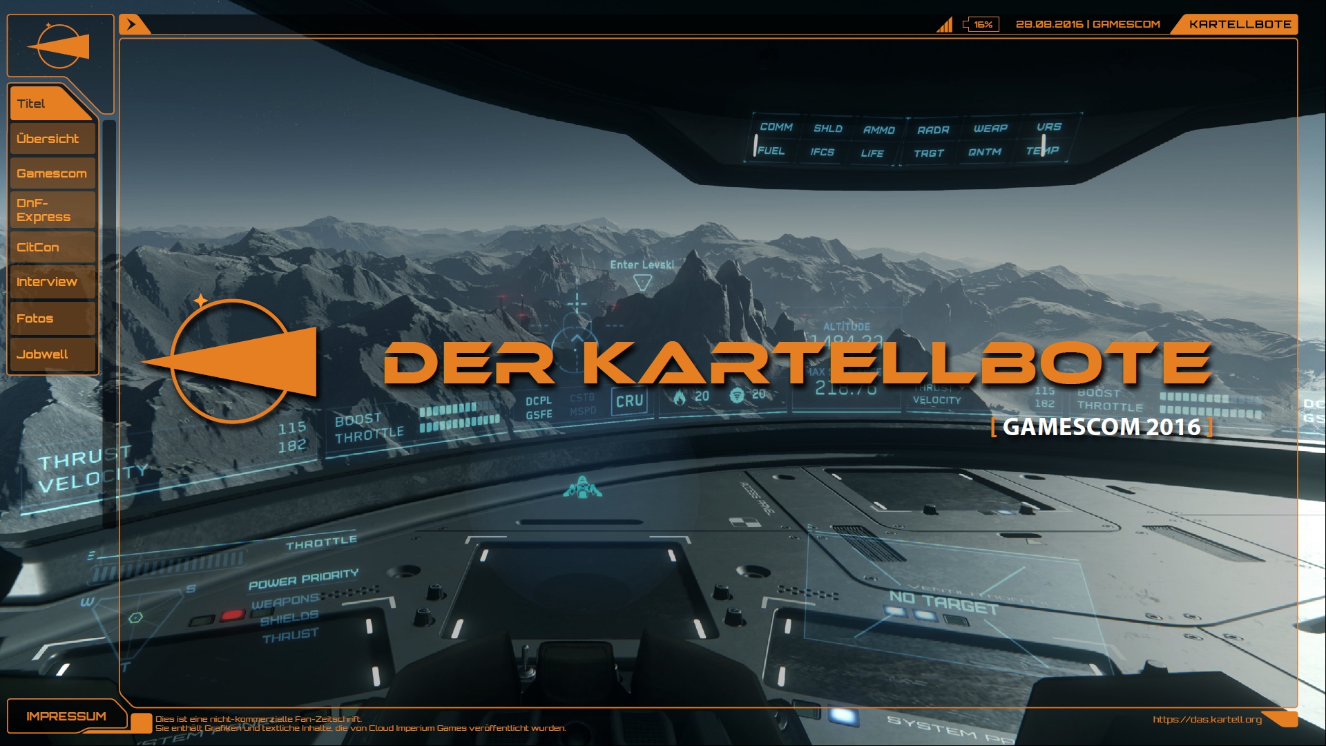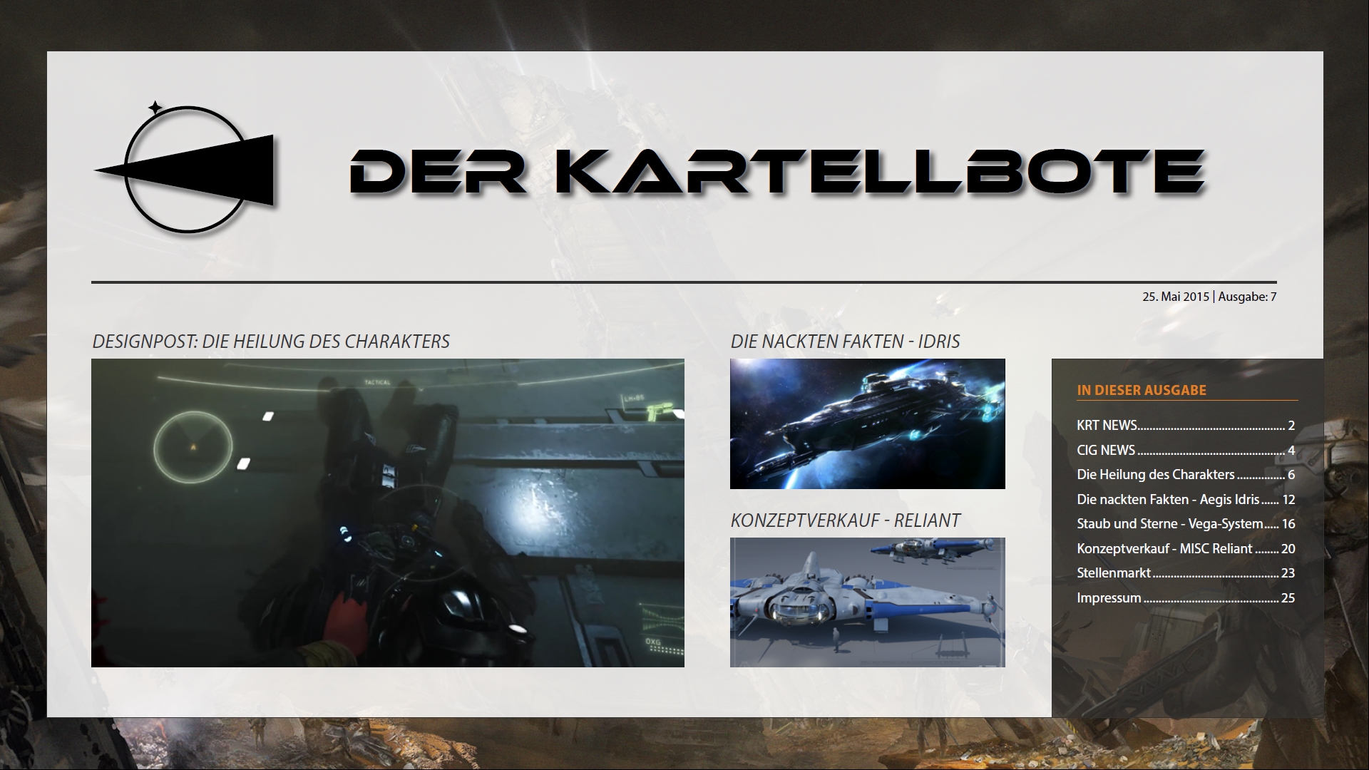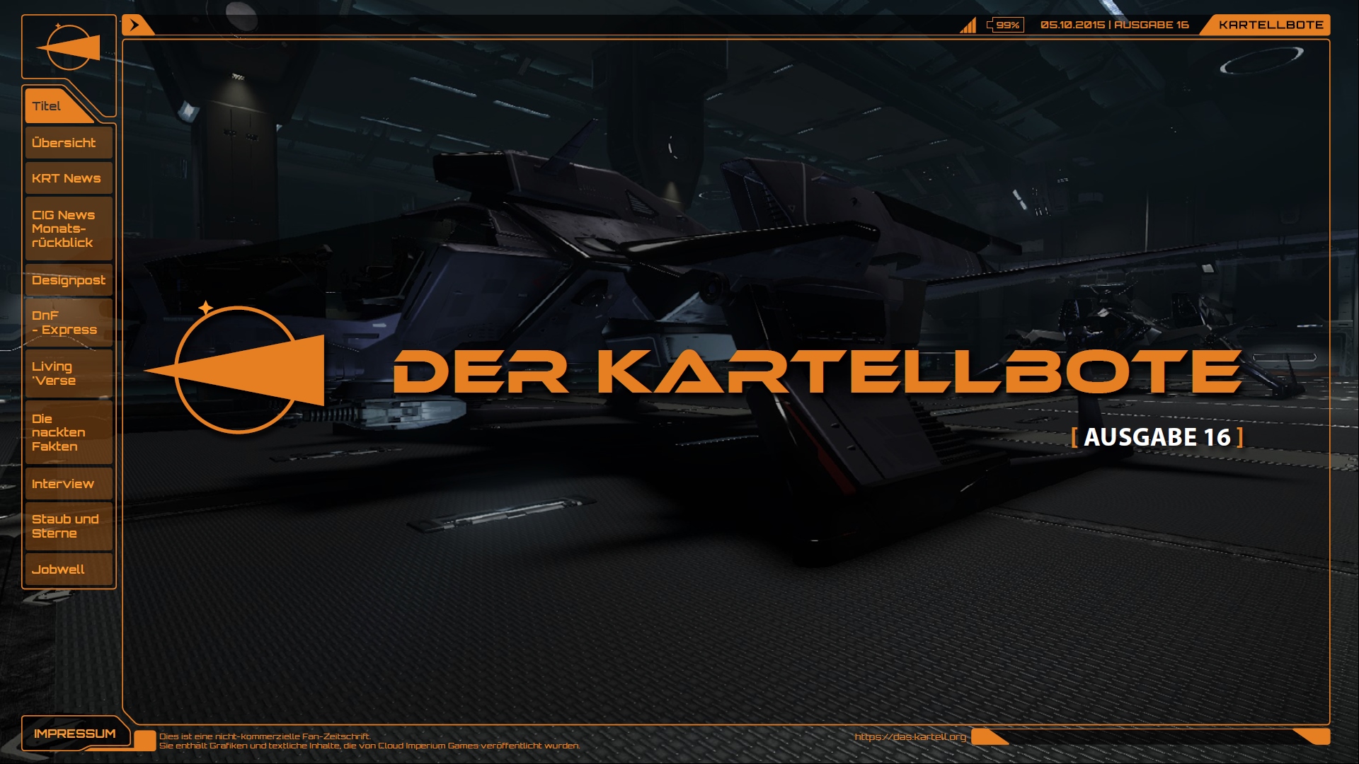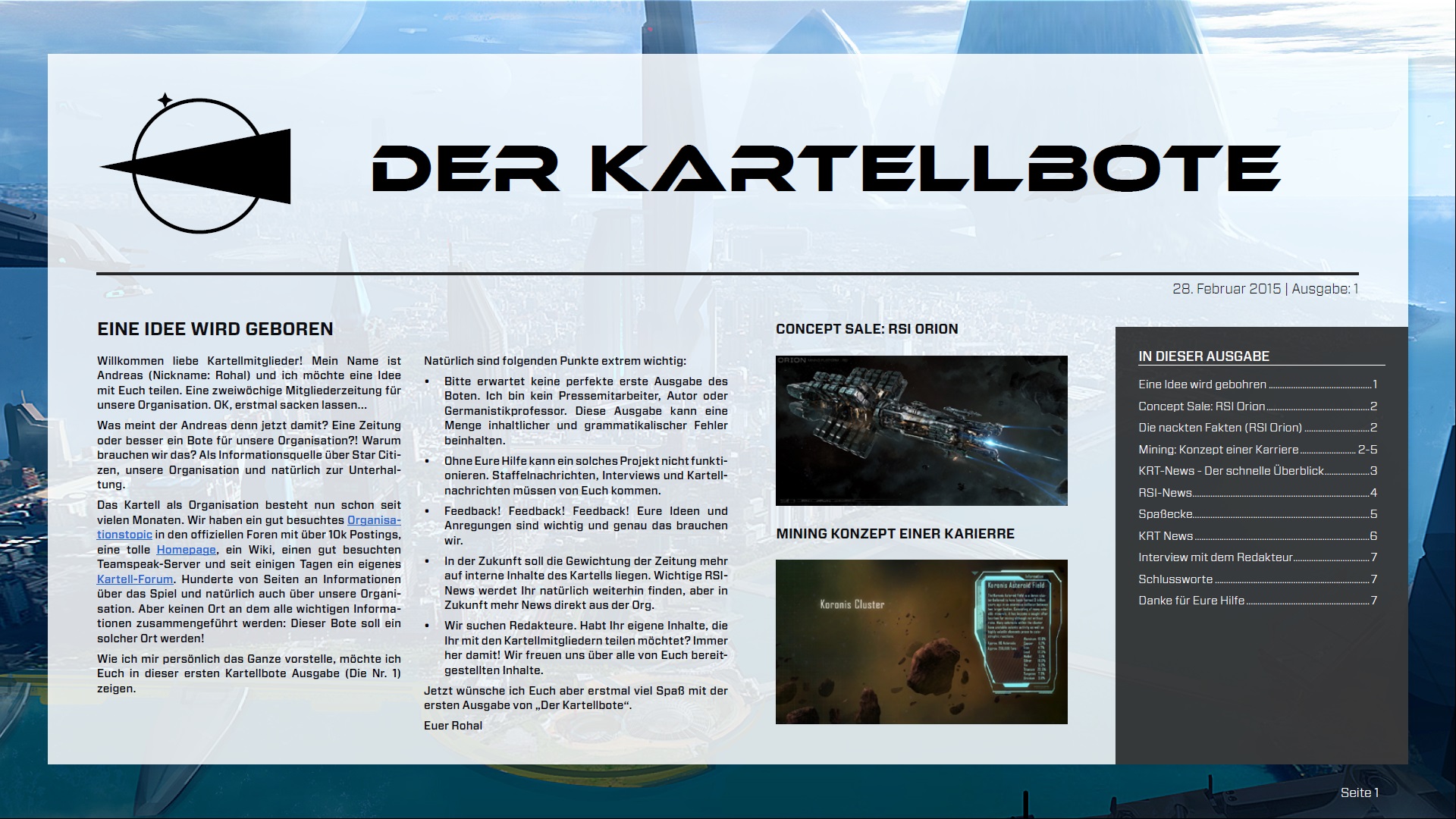 Hier findet ihr eine Übersicht sämtlicher Ausgaben der Kartell-Magazine "Der Kartellbote" und "The Chronos Times". Damit die interaktive Menüführung des Kartellboten funktioniert, empfehlen wir, die PDF herunterzuladen und in einem PDF-Viewer zu betrachten, anstatt sie sich im Browser anzuschauen. Um uns Feedback zukommen zu lassen, könnt ihr dieses Thema in unserem Forum verwenden. Wir wünschen viel Spaß beim Lesen!