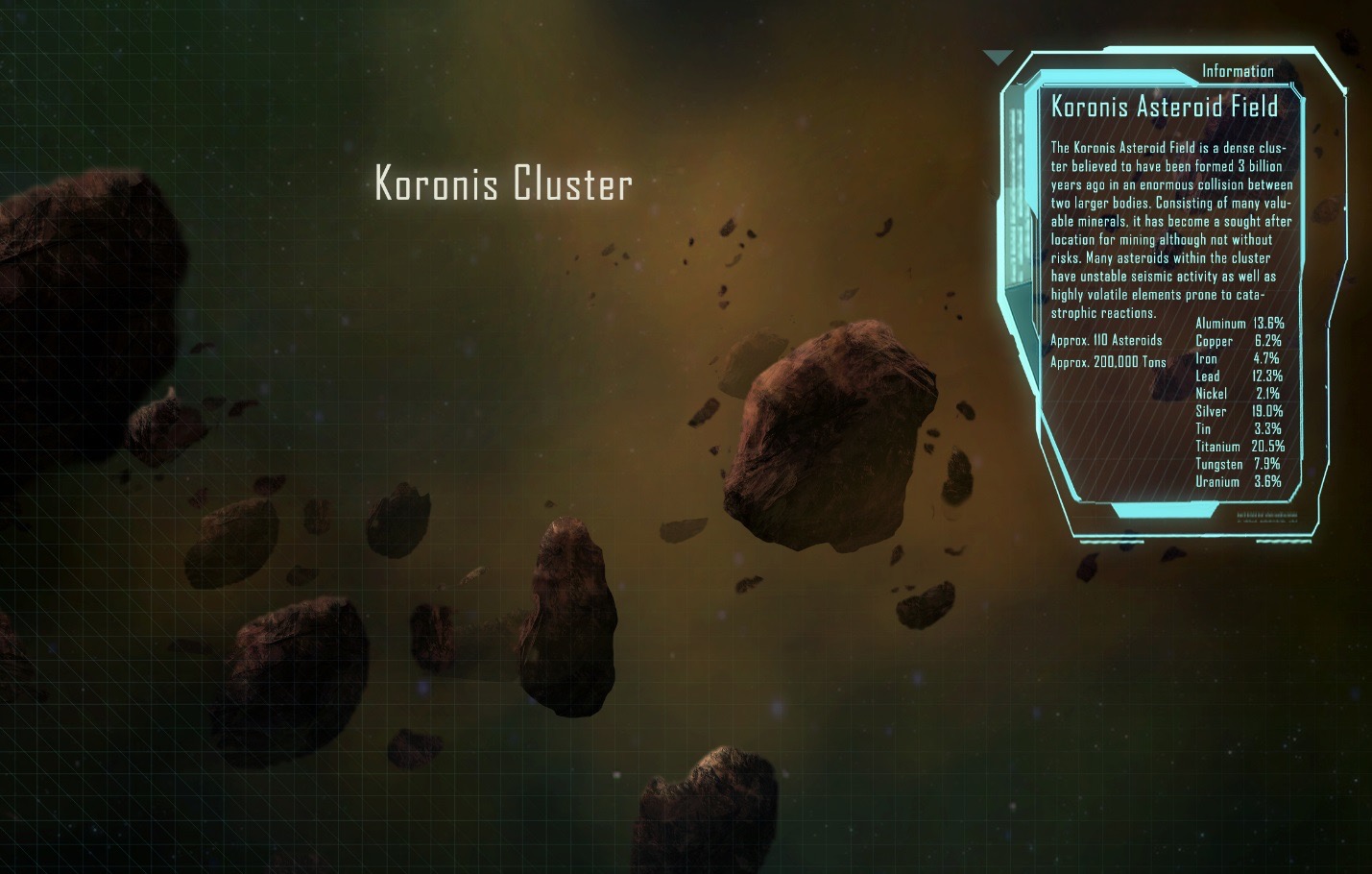 Wertvolle Mineralien (für den maximalen Profit) werdet ihr nicht einfach auf dem Silbertablett serviert bekommen. Dies bedeutet nicht immer, dass ihr euch erst durch eine Horde von Feinden schießen müsst, es kann auch andere Gefahren geben, die nicht von Spielern oder NPCs ausgehen. Sehr wertvolle Mineralien können z.B. in einem sehr gefährlichen Asteroidenfeld liegen und sehr unerfahrene Piloten werden die entsprechenden Abbaugebiete nicht erreichen können, ohne ihr Schiff massiv zu beschädigen oder gar zu zerstören.