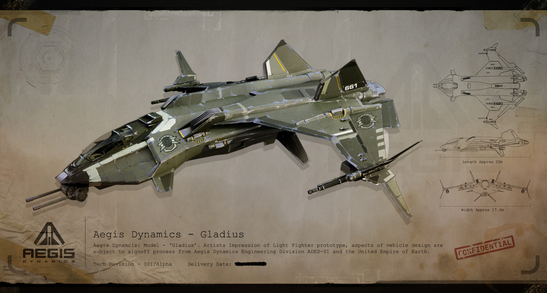 Die Gladius ist ein älteres Design, das im Laufe der Jahre immer wieder auf den neusten Stand der Technik gebracht wurde, um mit neuen, moderneren Schiffen mithalten zu können. In militärischen Kreisen wird die Gladius wegen ihrer Schlichtheit und Leistungsfähigkeit sehr geschätzt. Sie ist ein schneller und leichter Jäger, der sich voll auf den Raumkampf fokussiert, was sie zu einem hervorragenden Begleit- und Abfangjäger macht. Aufgrund ihrer geringen Anzahl beweglicher Teile ist die Gladius im Gegensatz zur Hornet sowohl für neue Piloten schneller zu beherrschen als auch für das Bodenpersonal einfacher zu warten.