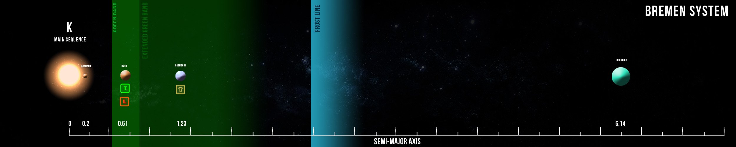 Dieser enorme Eisriese wird von Bremens Einwohnern als „Wächter des Systems“ betrachtet, für seine Rolle, die er beim Schutz der inneren Welten vor Kometen spielt. (Maßgebliche Beweise gibt es für diese Annahme jedoch nicht.) Die wirbelnde Masse aus Wasserstoff und anderen Gasen besitzt eine Vielzahl von Eisfeldern, was zu einer besonders schönen planetarischen Landschaft beiträgt. Unglücklicherweise ist das Auftanken von Gas auf Bremen IV aufgrund des Fehlens von klaren Gasfeldern nicht möglich. Nicht selten kann man die zerfallenden Wracks von Schiffen sturer Kapitäne im Orbit dieser Welt finden, die den Versuch unternahmen, ihre Starfarer oder Caterpillar hier aufzutanken.