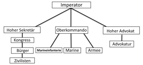 Der Imperator: Ursprünglich war der Imperator ein Diktator, doch diese Institution wurde nach dem Ende der Messer-Ära umstrukturiert, so dass sie heute eher dem Amt eines Präsidenten ähnelt (demokratisch gewählt, nur eine Amtszeit, nicht verrückt usw.) Um Ivar Messer zu zitieren: "Jedes Schiff braucht einen Kapitän." Der Imperator ist die Galionsfigur der UEE und wird von dem Hohen Sekretär (High-Secretary) und dem Hohen Advokaten (High-Advocate) beraten. Er darf heutzutage nur noch eine einzige zehnjährige Amtszeit lang herrschen. Die Aufgabe des Imperators ist, finale Entscheidungen zu treffen. Gesetzesentwürfe nehmen ihren Anfang im Senat, werden an den Hohen Sekretär weitergereicht und kommen schließlich beim Imperator an, der sie entweder billigen oder sein Veto einlegen kann.