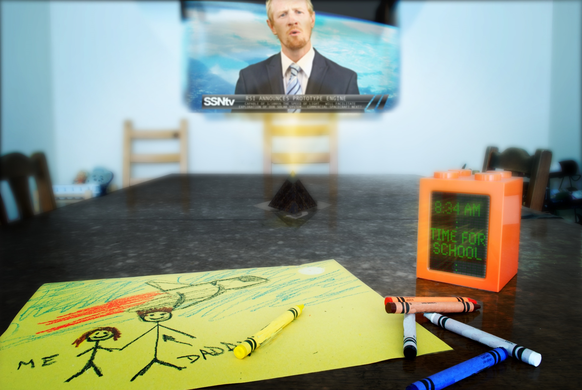 "Mama hat heute schon wieder Omelette gemacht... Ich habe gemalt, als ich Papa auf dem Holo sah. Ich habe Mama gerufen. Danny fing an zu schreien und rannte um den Tisch. Voll nervig. Da war er, er stand direkt neben dem Präsidenten! Sie redeten über den Weltraum und so ein Zeug, was irgendwie cool war, aber er sah so wichtig aus, wie er da stand. Wir hatten ihn schon so lange nicht mehr gesehen. Er hatte jetzt einen Bart. Mama mag das nicht, aber ich finde, es sieht witzig aus.