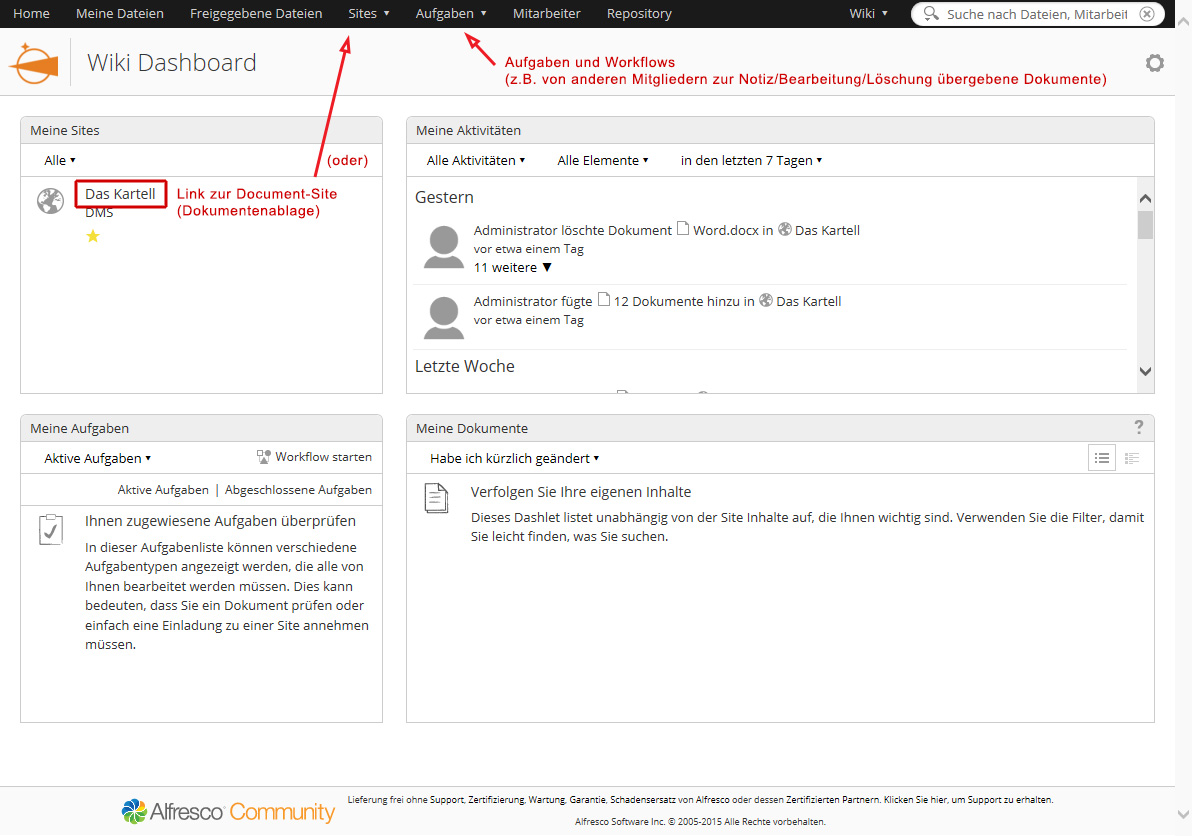 Auf der Startseite (Home) findet ihr einen Link zur Document-Site des Kartells (im Bild rot markiert).